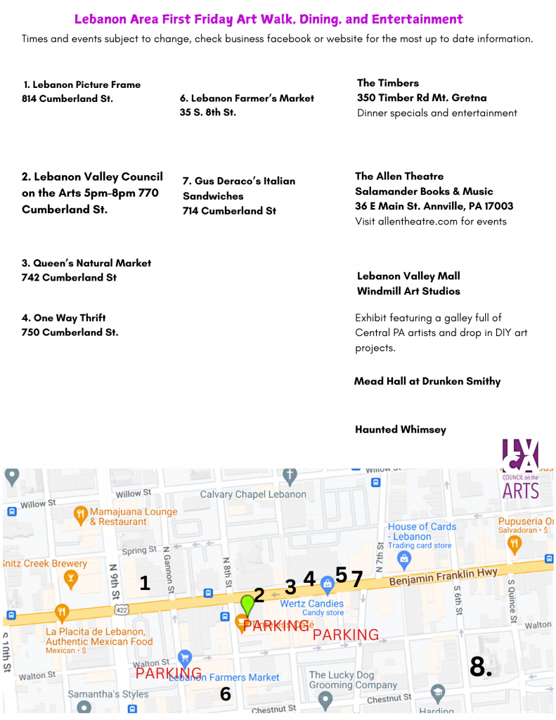 To list a First Friday event, email us at lebanonartscouncil@gmail.com Include: address and phone number of the venue, the name of the artist or musician, and a short description of the artwork or style of music being offered.